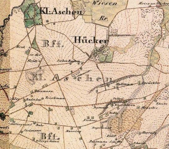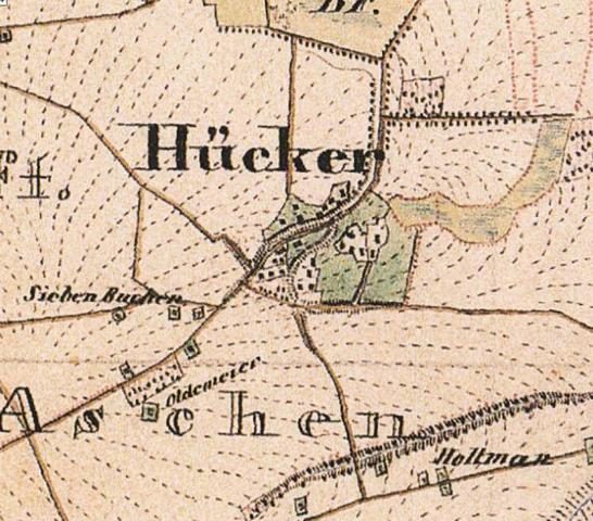 Der Stadtteil Hücker-Aschen hat seinen Ursprungskern im Bereich der heutigen Straßen “Hücker-Dorf” / “Sattelmeierweg” / “Gehlenbrink”. Gleichwohl gab es zusätzlich einige vertreut liegende Gebäude.