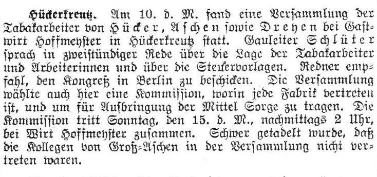 Gestern Morgen gegen 1/2 12 Uhr wurde der unterzeichnete Amtmann nach der Cigarenfabrik der Gebr. André hiers. gerufen, mit der Bemerkung, daß in der Fabrik eine complotartige Zusammenrottung, Arbeitsverweigerung und Ruhestörung stattfinde.