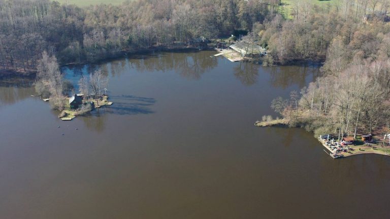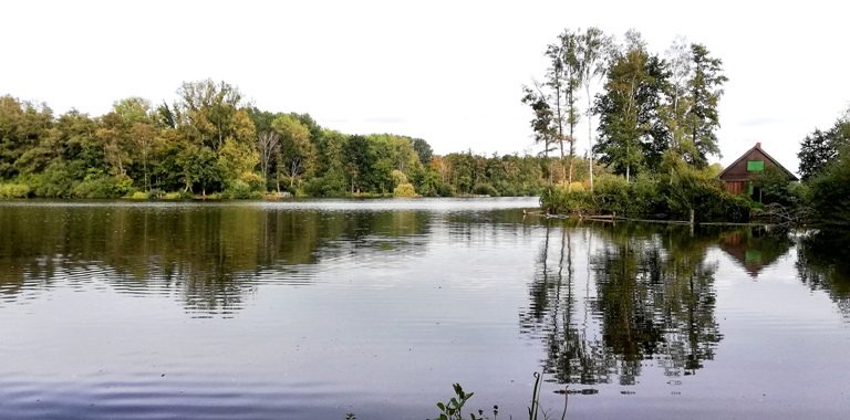 Rechts die Anglerhütte auf der Landzunge im Hücker Moor.