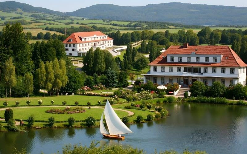 Kurhaus Hücker Moor mit schönem Park, herrlich gelegen am 60 Morgen großen Hückersee. Behagliche Gasträume, erstklassige Küche. 30 moderne Zimmer mit fließendem kalten und warmen Wasser. Bäder im Hause, Freibad und Sauna, sowie Garagen vorhanden. Pension mit 4 Mahlzeiten. Idealer Erholungsaufenthalt für Ferien und Wochenenden.