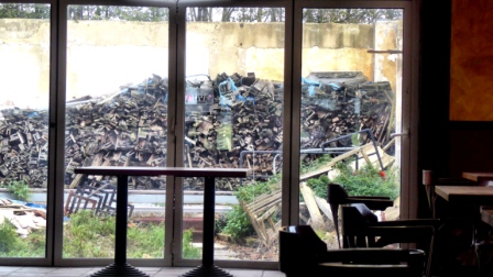 Oktober 2019. Alles ist leer. Im Hintergrund sieht man den Steinhaufen. Das Dach vom Saal ist eingestürzt.