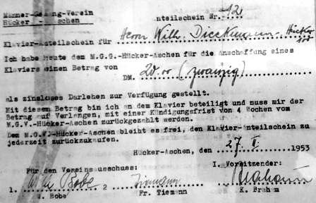 Um 1953 ein Klavier kaufen und bezahlen zu können, wurden “Klavier-Anteilscheine” ausgegeben. So war die Finanzierung gesichert.