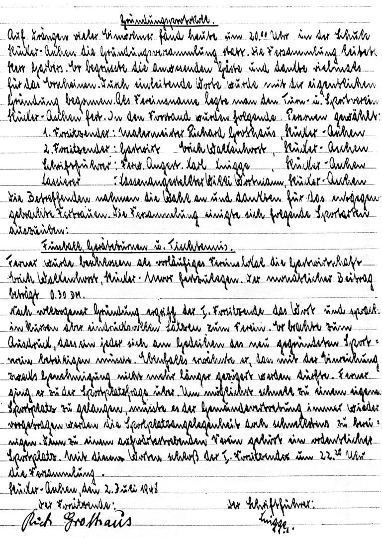 „Auf Drängen vieler Einwohner“… so beginnt das Protokoll der Versammlung, wurde am 02. Juli 1948 der Turn- und Sportverein Hücker-Aschen in den Räumen der Volksschule gegründet