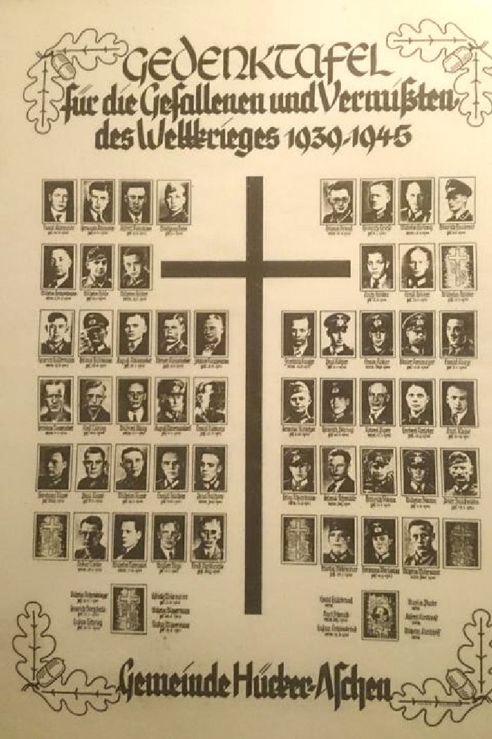 88 Männer in den besten Jahren und 1 junges Mädel sind nicht zurückgekehrt. Von 42 Männern liegt die endgültige Nachricht vor, dass sie gefallen sind. Die übrigen 46 Männer sind im Osten vermisst. Mit den Angehörigen hoffen wir, dass der eine oder andere doch noch in seine Heimat Hücker-Aschen zurückkehrt.